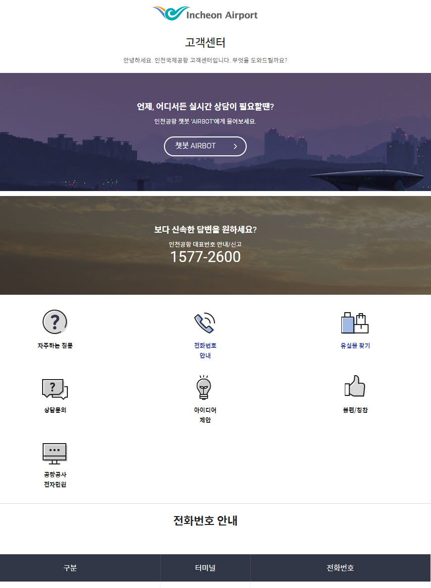 인천공항 대표 고객센터 전화번호는 1577-2600입니다.